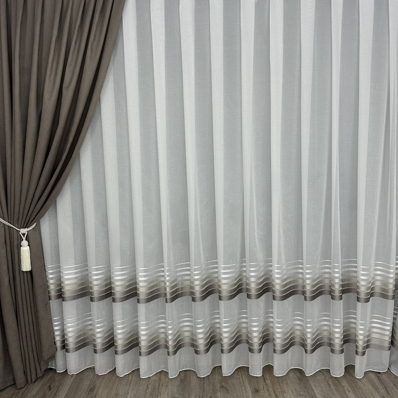 Основа гардини - льон, тонка та легка тканина з чітко вираженим полотняним плетінням волокон та матовою поверхнею. Смужки більш чіткі ніж основа, мають сітчасту структуру з рельєфним фактурним візерунком. Тюль виглядає повітряно, натурально, самобутньо і дуже стильно.